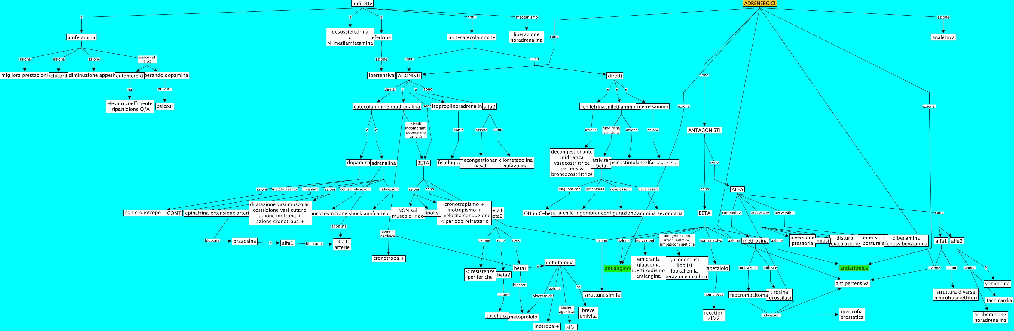 Este Cmap, tiene información relacionada con: adrenergici, BETA azioni NON sul muscolo iride, AGONISTI è noradrenalina, BETA azione antiaritmica, indirette è desossiefedrina o N-metilamfetamina, ANTAGONISTI sono BETA, dopamina azioni non cronotropo -, BETA hanno struttura simile, ANTAGONISTI sono ALFA, ALFA provocano miosi, beta1 beta2 azione < resistenze periferiche, amfetamina agisce sul SNC liberando dopamina, ALFA provocano ipotensione posturale, feocromocitoma indicazioni ipertrofia prostatica, non-catecolammine sono diretti, ALFA indicazioni ipertrofia prostatica, dobutamina bloccato da metoprololo, feniletilammina azione psicostimolante, alfa1 bloccante alfa1 arterie, catecolammine è adrenalina, dobutamina anche agonista alfa