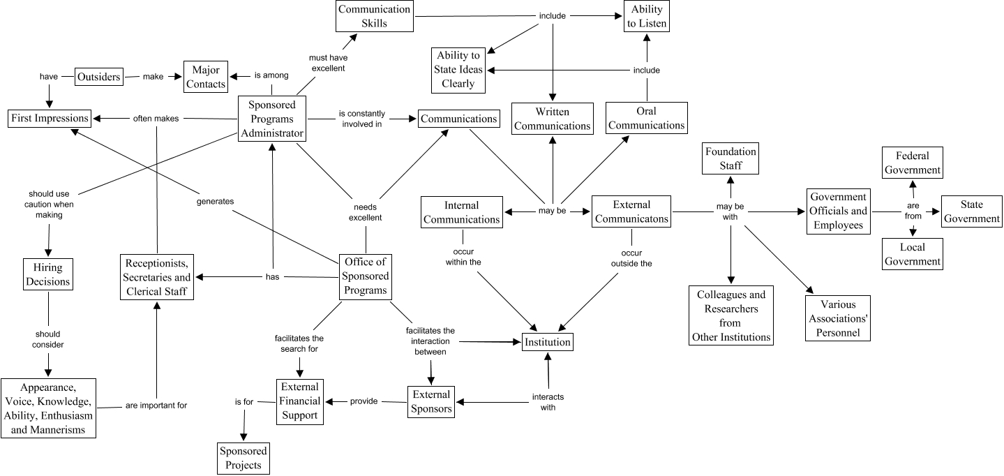 This Concept Map, created with IHMC CmapTools, has information related to: 07 - Comm Systems and Info Sources, Communications may be Internal Communications, Sponsored Programs Administrator is among Major Contacts, External Communicatons may be with Various Associations' Personnel, Internal Communications occur within the Institution, Office of Sponsored Programs has Sponsored Programs Administrator, Oral Communications include Ability to State Ideas Clearly, Government Officials and Employees are from State Government, Hiring Decisions should consider Appearance, Voice, Knowledge, Ability, Enthusiasm and Mannerisms, External Communicatons may be with Government Officials and Employees, Government Officials and Employees are from Federal Government, External Communicatons may be with Colleagues and Researchers from Other Institutions, Communication Skills include Ability to State Ideas Clearly, External Sponsors interacts with Institution, Institution facilitates the interaction between External Sponsors, Outsiders have First Impressions, Office of Sponsored Programs facilitates the interaction between External Sponsors, External Sponsors provide External Financial Support, Office of Sponsored Programs facilitates the search for External Financial Support, Office of Sponsored Programs generates First Impressions, Communications may be Written Communications