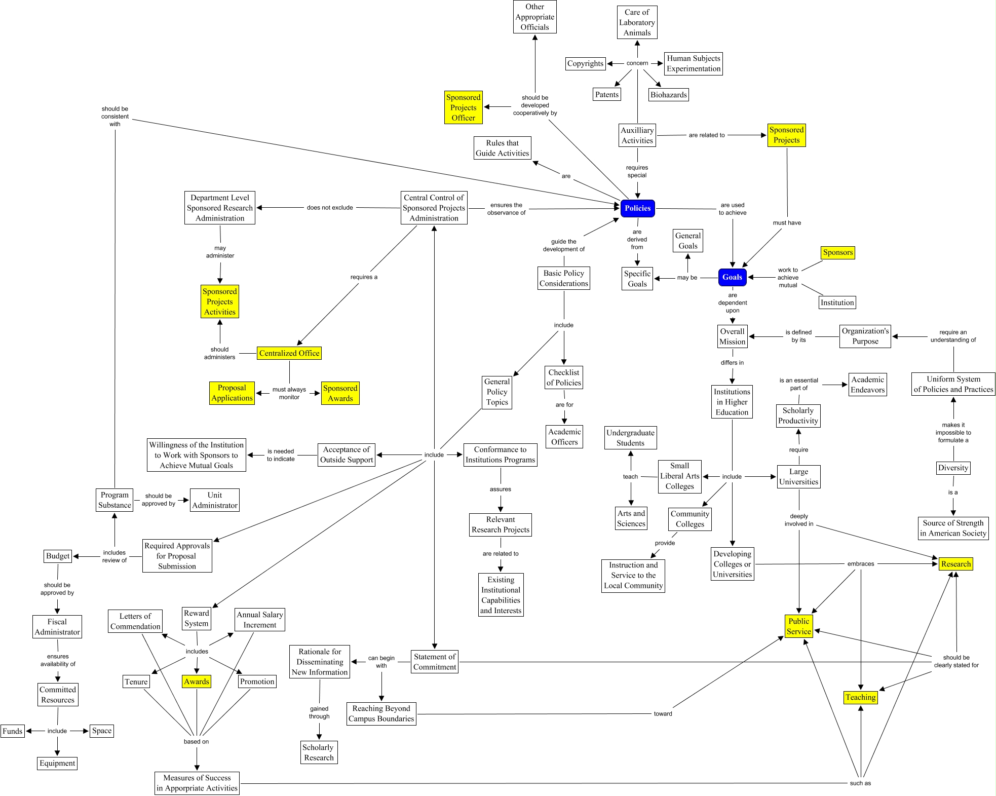 This Concept Map, created with IHMC CmapTools, has information related to: 03 - Goals and Policies, Developing Colleges or Universities embraces Research, Fiscal Administrator ensures availability of Committed Resources, Annual Salary Increment based on Measures of Success in Apporpriate Activities, Institutions in Higher Education include Developing Colleges or Universities, Auxilliary Activities concern Care of Laboratory Animals, Policies should be developed cooperatively by Other Appropriate Officials, Awards based on Measures of Success in Apporpriate Activities, Basic Policy Considerations include Checklist of Policies, Promotion based on Measures of Success in Apporpriate Activities, Tenure based on Measures of Success in Apporpriate Activities, Centralized Office must always monitor Sponsored Awards, Goals may be General Goals, Institutions in Higher Education include Community Colleges, Centralized Office must always monitor Proposal Applications, Rationale for Disseminating New Information gained through Scholarly Research, General Policy Topics include Acceptance of Outside Support, Institutions in Higher Education include Large Universities, Auxilliary Activities are related to Sponsored Projects, Auxilliary Activities concern Human Subjects Experimentation, Policies are used to achieve Goals