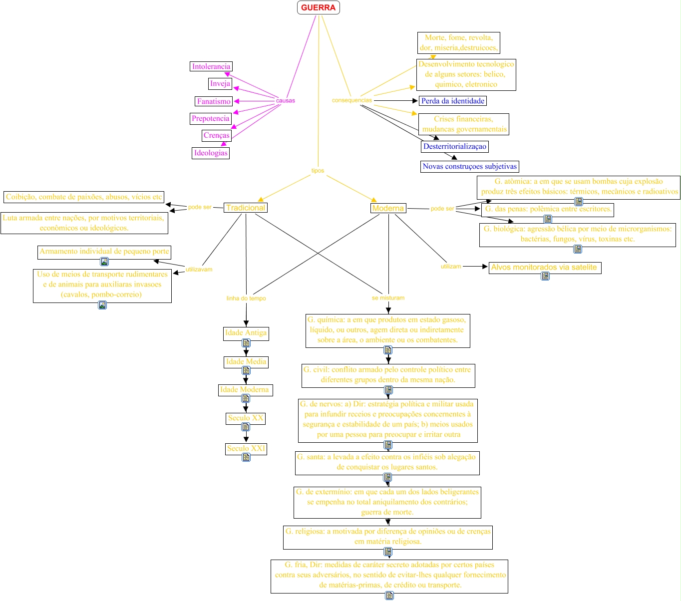 This Concept Map, created with IHMC CmapTools, has information related to: GuerraIII, Moderna se misturam G. química: a em que produtos em estado gasoso, líquido, ou outros, agem direta ou indiretamente sobre a área, o ambiente ou os combatentes., Tradicional utilizavam Uso de meios de transporte rudimentares e de animais para auxiliaras invasoes (cavalos, pombo-correio), GUERRA causas Fanatismo, Moderna se misturam G. de extermínio: em que cada um dos lados beligerantes se empenha no total aniquilamento dos contrários; guerra de morte., Moderna linha do tempo Seculo XXI, GUERRA consequencias Morte, fome, revolta, dor, miseria,destruicoes,, GUERRA causas Crenças, GUERRA consequencias Desterritorializaçao, Tradicional se misturam G. fria, Dir: medidas de caráter secreto adotadas por certos países contra seus adversários, no sentido de evitar-lhes qualquer fornecimento de matérias-primas, de crédito ou transporte., GUERRA consequencias Perda da identidade, Tradicional pode ser Luta armada entre nações, por motivos territoriais, econômicos ou ideológicos., Moderna se misturam G. fria, Dir: medidas de caráter secreto adotadas por certos países contra seus adversários, no sentido de evitar-lhes qualquer fornecimento de matérias-primas, de crédito ou transporte., Tradicional linha do tempo Idade Moderna, GUERRA tipos Moderna, Tradicional se misturam G. santa: a levada a efeito contra os infiéis sob alegação de conquistar os lugares santos., Tradicional linha do tempo Idade Antiga, Tradicional linha do tempo Idade Media, Moderna se misturam G. de nervos: a) Dir: estratégia política e militar usada para infundir receios e preocupações concernentes à segurança e estabilidade de um país; b) meios usados por uma pessoa para preocupar e irritar outra, Moderna linha do tempo Idade Media, Moderna linha do tempo Idade Moderna