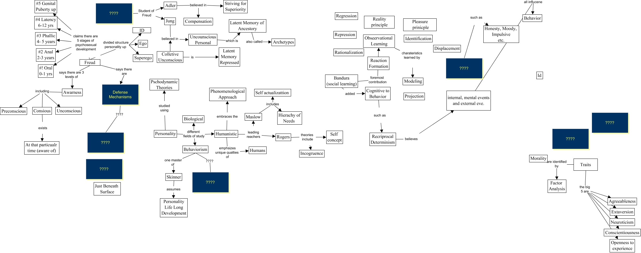 This Concept Map, created with IHMC CmapTools, has information related to: personality, Skinner assumes Personality Life Long Development, Cognitive to Behavior such as Recriprocal Determinism, Humanistic embraces the Phenomenological Approach, ???? such as Honesty, Moody, Impulsive etc., Humanistic leading reachers Maslow, Jung believed in Uncounscious Personal, Humanistic leading reachers Rogers, Traits the big 5 are Agreeableness, Freud divided structure personality up ID, ???? Student of Freud Adler, internal, mental events and external eve. all influcene Behavior, Awarness including Preconscious, Personality studied using Pschodynamic Theories, ???? Student of Freud Jung, Behaviorism one master of Skinner, Freud says there are 3 levels of Awarness, Traits the big 5 are Openness to experience, Freud claims there are 5 stages of psychosexual development #3 Phallic 4- 5 years, Traits the big 5 are Conscientiousness, Maslow includes Hierachy of Needs