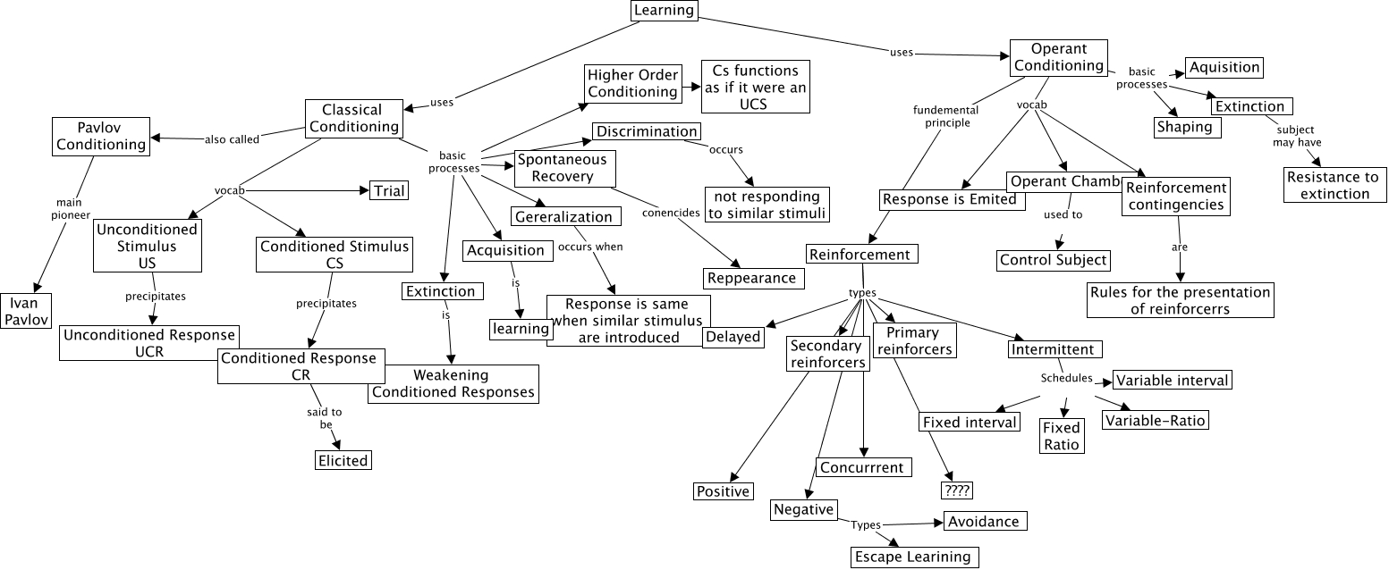 This Concept Map, created with IHMC CmapTools, has information related to: learning, Reinforcement types Positive, Operant Conditioning basic processes Shaping, Acquisition is learning, Reinforcement contingencies are Rules for the presentation of reinforcerrs, Negative Types Avoidance, Operant Conditioning basic processes Extinction, Classical Conditioning basic processes Extinction, Extinction is Weakening Conditioned Responses, Classical Conditioning vocab Trial, Reinforcement types Negative, Reinforcement types Primary reinforcers, Intermittent Schedules Variable-Ratio, Learning uses Classical Conditioning, Unconditioned Stimulus US precipitates Unconditioned Response UCR, Classical Conditioning basic processes Acquisition, Higher Order Conditioning is Cs functions as if it were an UCS, Classical Conditioning basic processes Discrimination, Spontaneous Recovery conencides Reppearance, Reinforcement types Positive, Pavlov Conditioning main pioneer Ivan Pavlov