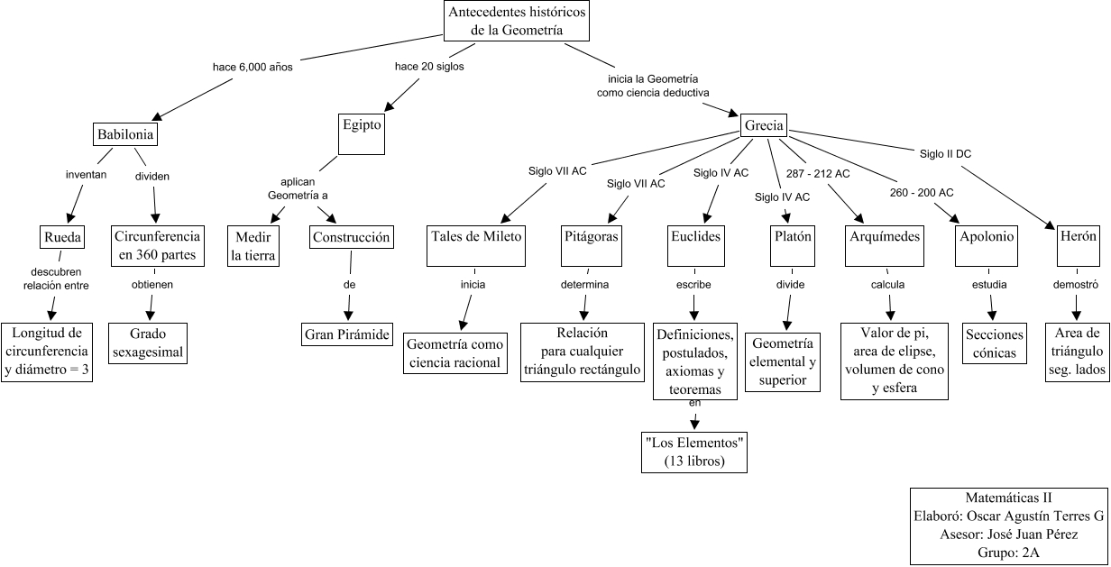 Este Cmap, tiene información relacionada con: Tecnologia en Aula, Arquímedes calcula Valor de pi, area de elipse, volumen de cono y esfera, Apolonio estudia Secciones cónicas, Pitágoras determina Relación para cualquier triángulo rectángulo, Babilonia dividen Circunferencia en 360 partes, Antecedentes históricos de la Geometría inicia la Geometría como ciencia deductiva Grecia, Grecia Siglo II DC Herón, Grecia Siglo IV AC Platón, Antecedentes históricos de la Geometría hace 6,000 años Babilonia, Definiciones, postulados, axiomas y teoremas en "Los Elementos" (13 libros), Construcción de Gran Pirámide, Herón demostró Area de triángulo seg. lados, Grecia 260 - 200 AC Apolonio, Grecia Siglo VII AC Pitágoras, Antecedentes históricos de la Geometría hace 20 siglos Egipto, Circunferencia en 360 partes obtienen Grado sexagesimal, Euclides escribe Definiciones, postulados, axiomas y teoremas, Platón divide Geometría elemental y superior, Grecia 287 - 212 AC Arquímedes, Grecia Siglo IV AC Euclides, Babilonia inventan Rueda
