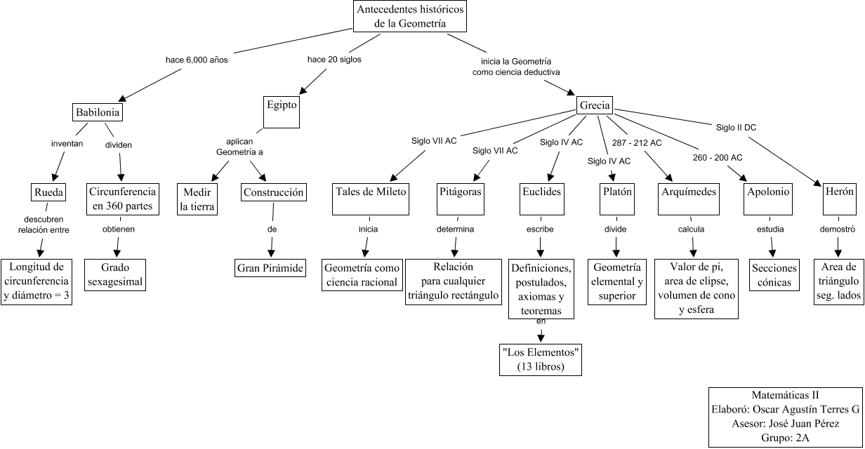 Esse mapa conceitual, produzido no IHMC CmapTools, tem a informação relacionada a: Antecedentes Historicos Geometria, Grecia 287 - 212 AC Arquímedes, Construcción de Gran Pirámide, Egipto aplican Geometría a Construcción, Definiciones, postulados, axiomas y teoremas en "Los Elementos" (13 libros), Babilonia dividen Circunferencia en 360 partes, Euclides escribe Definiciones, postulados, axiomas y teoremas, Grecia Siglo IV AC Euclides, Grecia Siglo VII AC Tales de Mileto, Apolonio estudia Secciones cónicas, Grecia Siglo II DC Herón, Tales de Mileto inicia Geometría como ciencia racional, Egipto aplican Geometría a Medir la tierra, Herón demostró Area de triángulo seg. lados, Grecia Siglo IV AC Platón, Babilonia inventan Rueda, Antecedentes históricos de la Geometría hace 6,000 años Babilonia, Platón divide Geometría elemental y superior, Circunferencia en 360 partes obtienen Grado sexagesimal, Antecedentes históricos de la Geometría inicia la Geometría como ciencia deductiva Grecia, Antecedentes históricos de la Geometría hace 20 siglos Egipto