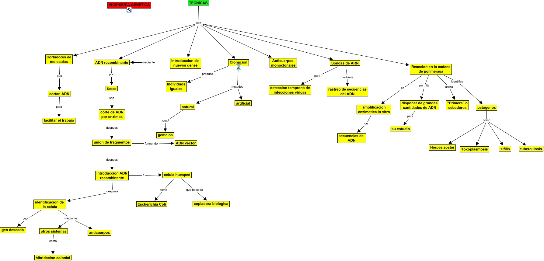 Este Cmap, tiene información relacionada con: tecnicas, union de fragmentos formando ADN vector, Reaccion en la cadena de polimerasa permite disponer de grandes cantidades de ADN, Clonacion metodos artificial, patogenos como tuberculosis, introduccion ADN recombinante despues identificacion de la celula, union de fragmentos despues introduccion ADN recombinante, Introduccion de nuevos genes mediante ADN recombinante, TECNICAS son Anticuerpos monoclonales, identificacion de la celula mediante otros sistemas, amplificacion enzimatica in vitro de secuencias de ADN, cortan ADN para facilitar el trabajo, fases son corte de ADN por enzimas, patogenos como Herpes zoster, otros sistemas como hibridacion colonial, Reaccion en la cadena de polimerasa identifica patogenos, identificacion de la celula con gen deseado, patogenos como Toxoplasmosis, introduccion ADN recombinante a celula huesped, celula huesped como Escherichia Coli, TECNICAS son ADN recombinante