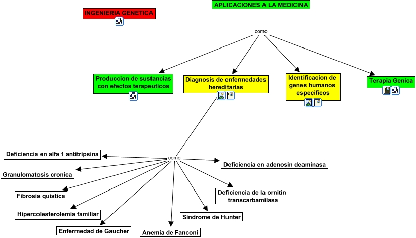 Este Cmap, tiene información relacionada con: APLICACIONES EN MEDICINA, Diagnosis de enfermedades hereditarias como Deficiencia de la ornitin transcarbamilasa, APLICACIONES A LA MEDICINA como Diagnosis de enfermedades hereditarias, Diagnosis de enfermedades hereditarias como Deficiencia en adenosin deaminasa, Diagnosis de enfermedades hereditarias como Deficiencia en alfa 1 antitripsina, Diagnosis de enfermedades hereditarias como Hipercolesterolemia familiar, Diagnosis de enfermedades hereditarias como Fibrosis quistica, Diagnosis de enfermedades hereditarias como Anemia de Fanconi, APLICACIONES A LA MEDICINA como Produccion de sustancias con efectos terapeuticos, APLICACIONES A LA MEDICINA como Identificacion de genes humanos especificos, APLICACIONES A LA MEDICINA como Terapia Genica, Diagnosis de enfermedades hereditarias como Granulomatosis cronica, Diagnosis de enfermedades hereditarias como Sindrome de Hunter, Diagnosis de enfermedades hereditarias como Enfermedad de Gaucher