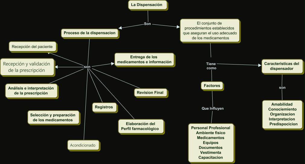 Este Cmap, tiene información relacionada con: Knowledge Representations, Elaboración del Perfil farmacológico son Recepción y validación de la prescripción, El conjunto de procedimientos establecidos que aseguran el uso adecuado de los medicamentos Tiene como Factores, Revision Final son Registros, Proceso de la dispensacion son Análisis e interpretación de la prescripción, Proceso de la dispensacion son Recepción y validación de la prescripción, La Dispensación Son El conjunto de procedimientos establecidos que aseguran el uso adecuado de los medicamentos, Revision Final son Entrega de los medicamentos e información, Elaboración del Perfil farmacológico son Recepción del paciente, Elaboración del Perfil farmacológico son Análisis e interpretación de la prescripción, Proceso de la dispensacion son Registros, Proceso de la dispensacion son Acondicionado, Revision Final son Recepción del paciente, Revision Final son Análisis e interpretación de la prescripción, Revision Final son Acondicionado, El conjunto de procedimientos establecidos que aseguran el uso adecuado de los medicamentos Tiene como Caracteristicas del dispensador, Proceso de la dispensacion son Recepción del paciente, Revision Final son Recepción y validación de la prescripción, Elaboración del Perfil farmacológico son Acondicionado, Elaboración del Perfil farmacológico son Entrega de los medicamentos e información, La Dispensación Son Proceso de la dispensacion