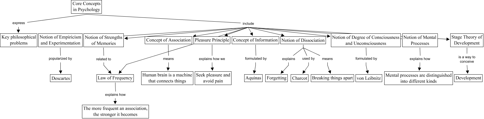 This Concept Map, created with IHMC CmapTools, has information related to: core concepts, Notion of Dissociation used by Charcot, Notion of Strengths of Memories related to Law of Frequency, Notion of Dissociation explains Forgetting, Core Concepts in Psychology include Concept of Association, Core Concepts in Psychology include Notion of Degree of Consciousness and Unconsciousness, Core Concepts in Psychology include Concept of Information, Notion of Mental Processes explains how Mental processes are distinguished into different kinds, Law of Frequency explains how The more frequent an association, the stronger it becomes, Core Concepts in Psychology include Notion of Dissociation, Pleasure Principle explains how we Seek pleasure and avoid pain, Core Concepts in Psychology express Key philosophical problems, Core Concepts in Psychology include Law of Frequency, Core Concepts in Psychology include Notion of Mental Processes, Stage Theory of Development is a way to conceive Development, Notion of Empiricism and Experimentation popularized by Descartes, Notion of Dissociation means Breaking things apart, Concept of Information formulated by Aquinas, Core Concepts in Psychology include Stage Theory of Development, Core Concepts in Psychology include Pleasure Principle, Core Concepts in Psychology include Notion of Empiricism and Experimentation