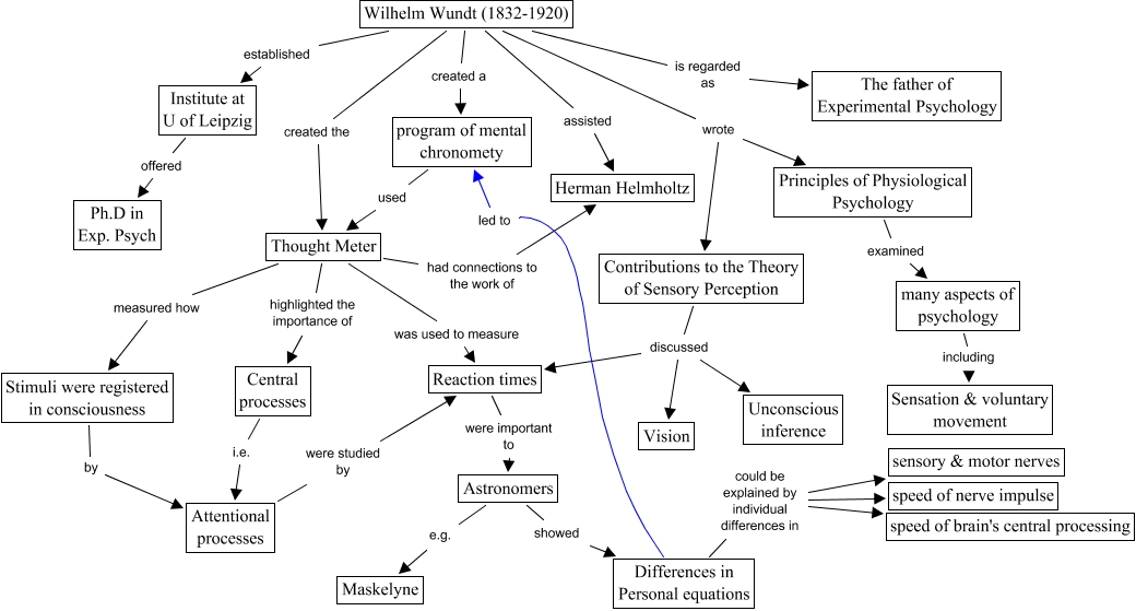 This Concept Map, created with IHMC CmapTools, has information related to: Wundt, Wilhelm Wundt (1832-1920) wrote Contributions to the Theory of Sensory Perception, Thought Meter had connections to the work of Herman Helmholtz, Wilhelm Wundt (1832-1920) assisted Herman Helmholtz, Contributions to the Theory of Sensory Perception discussed Unconscious inference, Thought Meter measured how Stimuli were registered in consciousness, Central processes i.e. Attentional processes, many aspects of psychology including Sensation & voluntary movement, Differences in Personal equations could be explained by individual differences in speed of nerve impulse, Attentional processes were studied by Reaction times, Wilhelm Wundt (1832-1920) is regarded as The father of Experimental Psychology, Differences in Personal equations could be explained by individual differences in speed of brain's central processing, Wilhelm Wundt (1832-1920) created a program of mental chronomety, Wilhelm Wundt (1832-1920) created the Thought Meter, Wilhelm Wundt (1832-1920) wrote Principles of Physiological Psychology, Thought Meter was used to measure Reaction times, Wilhelm Wundt (1832-1920) established Institute at U of Leipzig, program of mental chronomety used Thought Meter, Reaction times were important to Astronomers, Differences in Personal equations could be explained by individual differences in sensory & motor nerves, Astronomers showed Differences in Personal equations