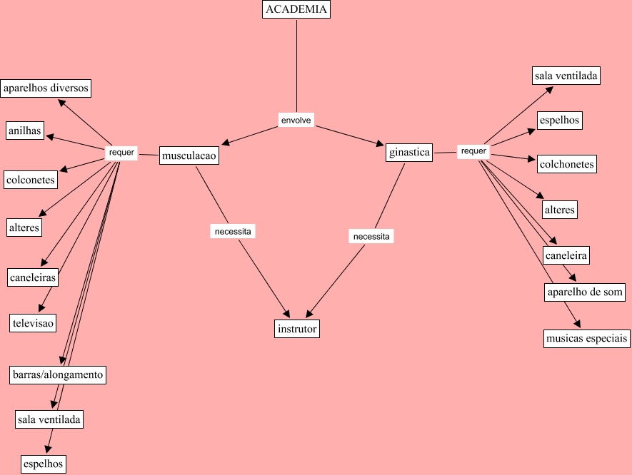 This Concept Map, created with IHMC CmapTools, has information related to: Academia, ginastica necessita instrutor, ginastica requer aparelho de som, ginastica requer alteres, musculacao requer espelhos, ginastica requer sala ventilada, musculacao requer colconetes, musculacao requer aparelhos diversos, ACADEMIA envolve ginastica, musculacao requer sala ventilada, ginastica requer musicas especiais, musculacao requer caneleiras, musculacao requer anilhas, musculacao requer televisao, ginastica requer caneleira, ginastica requer colchonetes, musculacao requer barras/alongamento, musculacao requer alteres, ginastica requer espelhos, ACADEMIA envolve musculacao, musculacao necessita instrutor