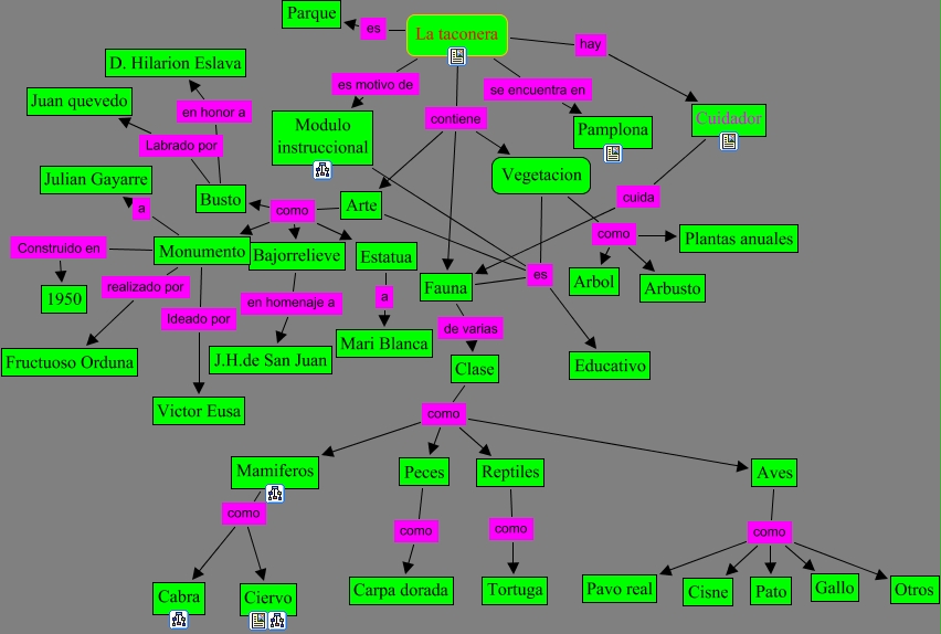 Este Cmap, tiene información relacionada con: La taconera, Vegetacion es Educativo, Arte como Estatua, Fauna es Educativo, Vegetacion como Arbol, Arte como Busto, Mamiferos como Ciervo, Vegetacion como Plantas anuales, Arte como Monumento, Reptiles como Tortuga, Clase como Aves, Clase como Peces, Aves como Pavo real, Mamiferos como Cabra, Monumento a Julian Gayarre, Busto en honor a D. Hilarion Eslava, Aves como Gallo, Arte es Educativo, Modulo instruccional es Educativo, Aves como Cisne, La taconera es Parque