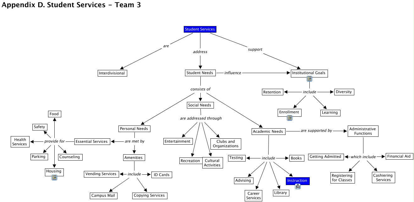 This Concept Map, created with IHMC CmapTools, has information related to: Student Services, Institutional Goals include Retention, Administrative Functions which include Registering for Classes, Academic Needs include Books, Social Needs are addressed through Clubs and Organizations, Academic Needs include Library, Amenities include Campus Mail, Institutional Goals include Diversity, Essential Services provide for Safety, Academic Needs include Testing, Academic Needs include Instruction, Essential Services provide for Parking, Student Services address Student Needs, Student Needs consists of Social Needs, Amenities include ID Cards, Essential Services provide for Health Services, Personal Needs are met by Essential Services, Student Services support Institutional Goals, Academic Needs include Advising, Student Services are Interdivisional, Administrative Functions which include Financial Aid