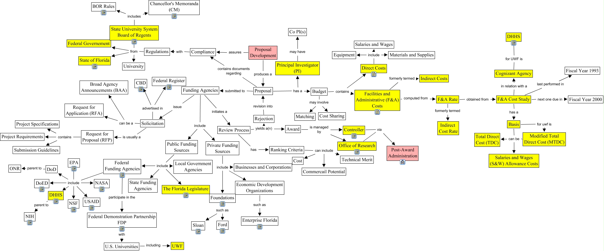 Este Cmap, tiene información relacionada con: Research Proposal, Federal Funding Agencies participate in the Federal Demonstration Partnership FDP, Budget may involve Cost Sharing, Solicitation advertised in CBD, Review Process yields a(n) Award, Private Funding Sources include Economic Development Organizations, Compliance with Regulations, Solicitation can be a Request for Application (RFA), Proposal Development assures Compliance, Ranking Criteria can include Technical Merit, Request for Proposal (RFP) contains Submission Guidelines, Direct Costs include Equipment, F&A Cost Study in relation with a Cognizant Agency, F&A Rate formerly termed Indirect Cost Rate, Basis for uwf is Modified Total Direct Cost (MTDC), F&A Cost Study last performed in Fiscal Year 1993, Basis can be Total Direct Cost (TDC), Foundations such as Sloan, Review Process yields a(n) Rejection, Federal Funding Agencies include NASA, Request for Proposal (RFP) contains Project Requirements