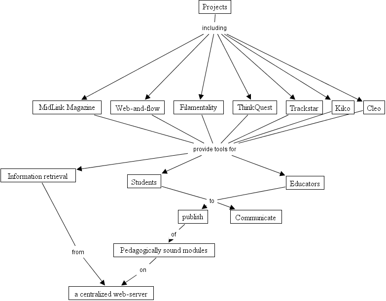 Constructive Learning in the Web, Information retrieval from a centralized web-server, Educators to publish, Projects including ThinkQuest, Cleo provide tools for Educators, publish of Pedagogically sound modules, Projects including Kiko, Projects including Trackstar, Cleo provide tools for Students, Educators to Communicate, Kiko provide tools for Educators