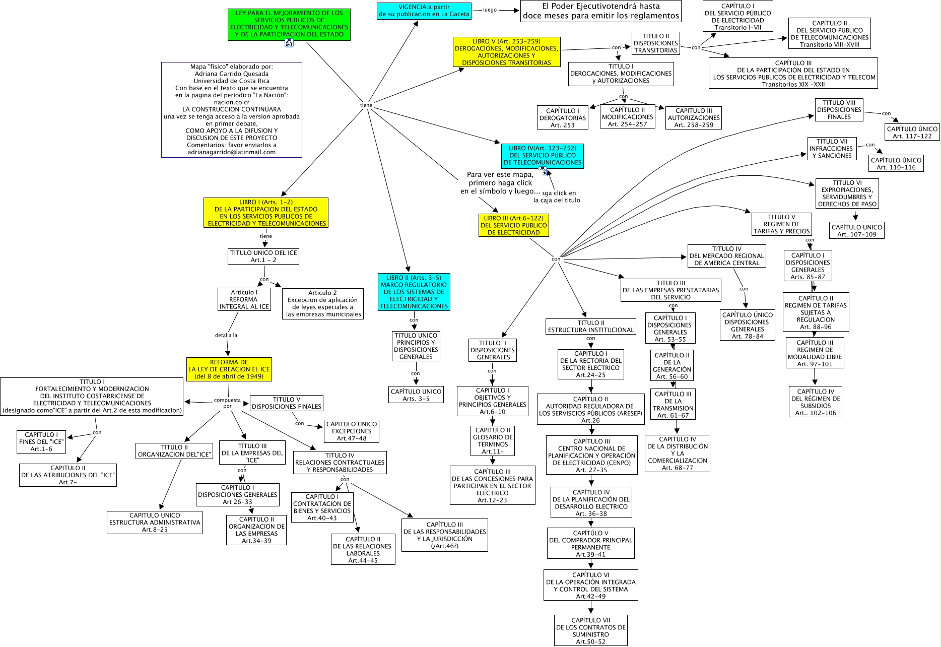 This Concept Map, created with IHMC CmapTools, has information related to: RAIZ, LEY PARA EL MEJORAMIENTO DE LOS SERVICIOS PUBLICOS DE ELECTRICIDAD Y TELECOMUNICACIONES Y DE LA PARTICIPACION DEL ESTADO tiene LIBRO II (Arts. 3-5) MARCO REGULATORIO DE LOS SISTEMAS DE ELECTRICIDAD Y TELECOMUNICACIONES, LEY PARA EL MEJORAMIENTO DE LOS SERVICIOS PUBLICOS DE ELECTRICIDAD Y TELECOMUNICACIONES Y DE LA PARTICIPACION DEL ESTADO tiene LIBRO III (Art.6-122) DEL SERVICIO PUBLICO DE ELECTRICIDAD, LIBRO III (Art.6-122) DEL SERVICIO PUBLICO DE ELECTRICIDAD con TITULO I DISPOSICIONES GENERALES, LEY PARA EL MEJORAMIENTO DE LOS SERVICIOS PUBLICOS DE ELECTRICIDAD Y TELECOMUNICACIONES Y DE LA PARTICIPACION DEL ESTADO tiene LIBRO I (Arts. 1-2) DE LA PARTICIPACION DEL ESTADO EN LOS SERVICIOS PUBLICOS DE ELECTRICIDAD Y TELECOMUNICACIONES, TITULO II DISPOSICIONES TRANSITORIAS con CAPÍTULO I DEL SERVICIO PÚBLICO DE ELECTRICIDAD Transitorio I-VII, TITULO II ESTRUCTURA INSTITUCIONAL con CAPÍTULO VI DE LA OPERACIÓN INTEGRADA Y CONTROL DEL SISTEMA Art.42-49, TITULO IV RELACIONES CONTRACTUALES Y RESPONSABILIDADES con CAPÍTULO III DE LAS RESPONSABILIDADES Y LA JURISDICCIÓN (¿Art.46?), TITULO IV DEL MERCADO REGIONAL DE AMERICA CENTRAL con CAPÍTULO ÚNICO DISPOSICIONES GENERALES Art. 78-84, TITULO V REGIMEN DE TARIFAS Y PRECIOS con CAPÍTULO II REGIMEN DE TARIFAS SUJETAS A REGULACION Art. 88-96, TITULO III DE LAS EMPRESAS PRESTATARIAS DEL SERVICIO con CAPITULO IV DE LA DISTRIBUCIÓN Y LA COMERCIALIZACION Art. 68-77, TITULO II ESTRUCTURA INSTITUCIONAL con CAPITULO I DE LA RECTORIA DEL SECTOR ELECTRICO Art.24-25, VIGENCIA:a partir de su publicacion en La Gaceta luego El Poder Ejecutivotendrá hasta doce meses para emitir los reglamentos, Para ver este mapa, primero haga click en el símbolo y luego... haga click en la caja del titulo LIBRO IV(Art. 123-252) DEL SERVICIO PUBLICO DE TELECOMUNICACIONES, TITULO III DE LAS EMPRESAS PRESTATARIAS DEL SERVICIO con CAPÍTULO II DE LA GENERACIÓN Art. 56-60, TÍTULO III DE LA EMPRESAS DEL "ICE" con CAPITULO I DISPOSICIONES GENERALES Art 26-33, TÍTULO III DE LA EMPRESAS DEL "ICE" con CAPITULO II ORGANIZACION DE LAS EMPRESAS Art.34-39, LIBRO III (Art.6-122) DEL SERVICIO PUBLICO DE ELECTRICIDAD con TITULO VII INFRACCIONES Y SANCIONES, TITULO I DEROGACIONES, MODIFICACIONES y AUTORIZACIONES con CAPÍTULO II MODIFICACIONES Art. 254-257, LIBRO III (Art.6-122) DEL SERVICIO PUBLICO DE ELECTRICIDAD con TITULO VIII DISPOSICIONES FINALES, LIBRO III (Art.6-122) DEL SERVICIO PUBLICO DE ELECTRICIDAD con TITULO III DE LAS EMPRESAS PRESTATARIAS DEL SERVICIO