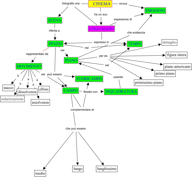 Questa Cmap, creata con IHMC CmapTools, contiene informazioni relative a: linguaggi non verbali, LINGUAGGIO fotografa una SCENA, CAMPO che può essere lungo, SPAZIO può essere CAMPO, SPAZIO può essere FUORICAMPO, MOVIMENTO è dissolvenza, MOVIMENTO è assolvenza, LINGUAGGIO espresso in TEMPO, PIANO nel TEMPO, CAMPO che può essere lunghissimo, PIANO che evidenzia EMOZIONI, CINEMA evoca EMOZIONI, CAMPO che può essere medio, CINEMA fotografa una SCENA, PIANO per es. dettaglio, CINEMA ha un suo LINGUAGGIO, LINGUAGGIO espresso in SPAZIO, PIANO per es. primissimo piano, SPAZIO rappresentato da MOVIMENTO, SPAZIO nel TEMPO, SPAZIO nel PIANO