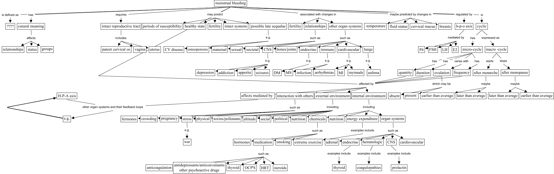 This Concept Map, created with IHMC CmapTools, has information related to: menstrual_cycle_jat_9_4_2001, internal environment including nutrition, organ systems such as hematologic, external environment including social, hematologic examples include coagulopathies, internal environment including organ systems, menstrual bleeding maybe predicted by changes in breasts, possible late sequalae e.g. osteoporosis, frequency affected by affects mediated by, duration affected by interaction with others, endocrine e.g. DM, external environment including stress, external environment including physical, cardivascular e.g. raynauds, organ systems such as cardiovascular, quantity affected by internal environment, relationships such as societal, duration affected by internal environment, duration affected by external environment, cyclic has micro-cycle, CNS examples include prolactin