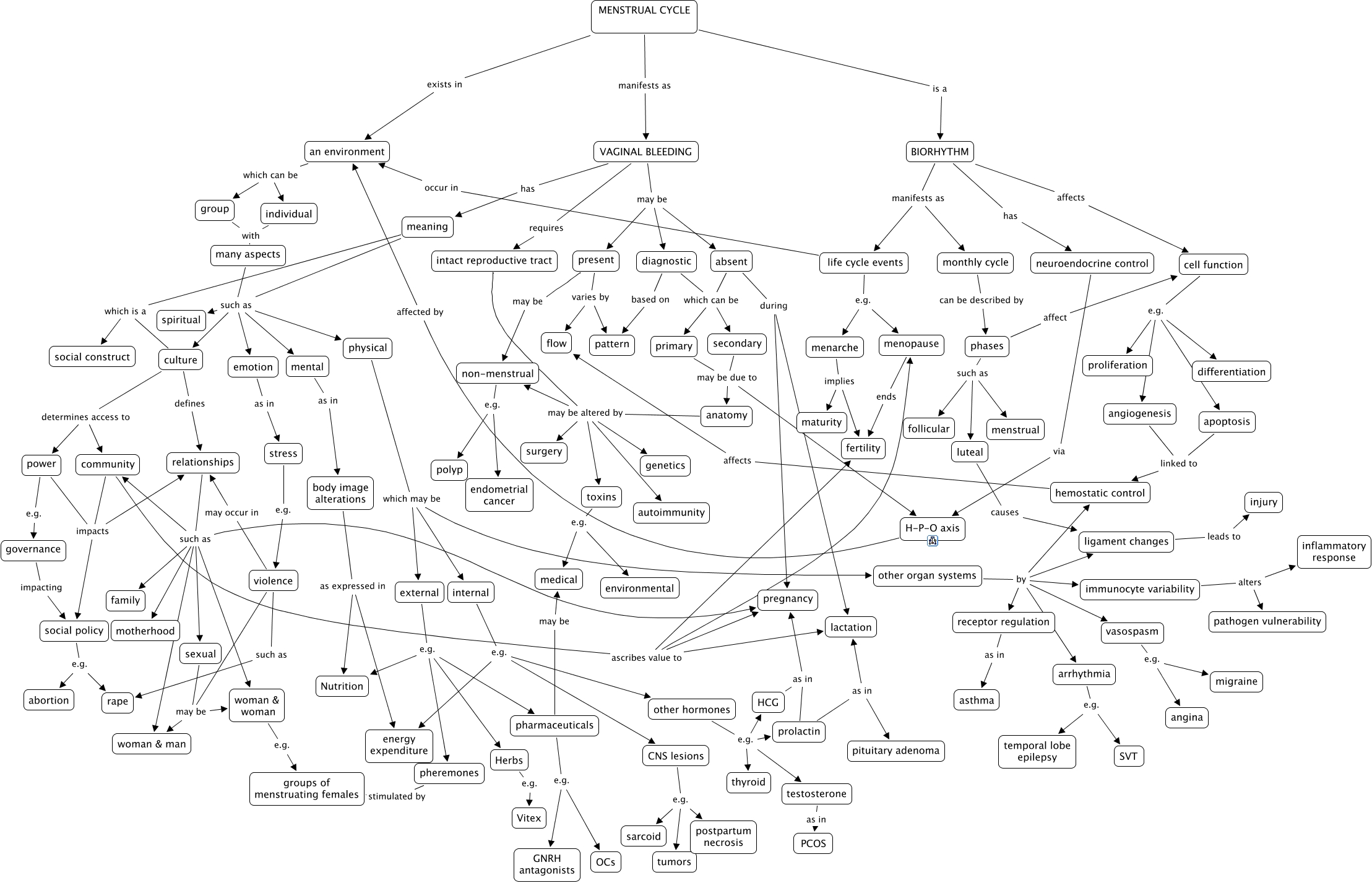 This Concept Map, created with IHMC CmapTools, has information related to: menstrual_cycle_context_revisions2_10_22, meaning such as mental, violence may be woman & man, culture defines relationships, power impacts social policy, neuroendocrine control via H-P-O axis, external e.g. pharmaceuticals, menarche implies fertility, pheremones stimulated by groups of menstruating females, body image alterations as expressed in energy expenditure, governance impacting social policy, arrhythmia e.g. temporal lobe epilepsy, toxins e.g. environmental, social policy e.g. rape, VAGINAL BLEEDING requires intact reproductive tract, VAGINAL BLEEDING may be diagnostic, emotion as in stress, other organ systems by arrhythmia, menopause ends fertility, primary may be due to anatomy, violence may be woman & woman