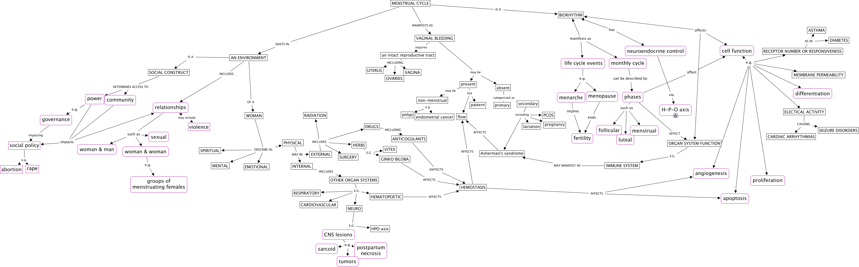 This Concept Map, created with IHMC CmapTools, has information related to: menstrual_cycle_10_22, MENSTRUAL CYCLE MANIFESTS AS VAGINAL BLEEDING, menopause ends fertility, governance impacting social policy, SOCIAL CONSTRUCT DETERMINES ACCESS TO power, WOMAN DESCRIBE AS SPIRITUAL, ELECTICAL ACTIVITY CAUSING CARDIAC ARRHYTHMIAS, ORGAN SYSTEM FUNCTION E.G. IMMUNE SYSTEM, OTHER ORGAN SYSTEMS E.G. NEURO, secondary including PCOS, GINKO BILOBA AFFECTS HEMOSTASIS, CNS lesions e.g. postpartum necrosis, HEMOSTASIS AFFECTS flow, WOMAN DESCRIBE AS PHYSICAL, present may be non-menstrual, OTHER ORGAN SYSTEMS E.G. CARDIOVASCULAR, SOCIAL CONSTRUCT DETERMINES ACCESS TO community, AN ENVIRONMENT IS A SOCIAL CONSTRUCT, relationships such as woman & man, present has pattern, neuroendocrine control via H-P-O axis