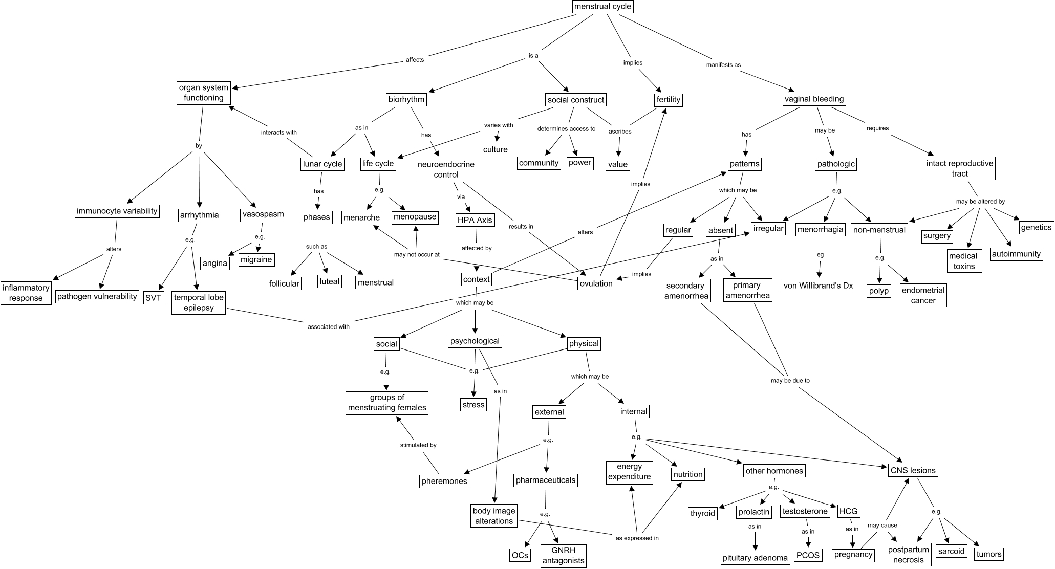 This Concept Map, created with IHMC CmapTools, has information related to: menstrual_cycle_emh_9_23, other hormones e.g. HCG, ovulation may not occur at menarche, physical which may be external, other hormones e.g. thyroid, context which may be psychological, vaginal bleeding may be pathologic, arrhythmia e.g. temporal lobe epilepsy, social construct determines access to power, CNS lesions e.g. sarcoid, lunar cycle has phases, physical which may be internal, internal e.g. nutrition, neuroendocrine control via HPA Axis, life cycle e.g. menarche, body image alterations as expressed in nutrition, arrhythmia e.g. SVT, menstrual cycle is a biorhythm, pheremones stimulated by groups of menstruating females, phases such as menstrual, non-menstrual e.g. endometrial cancer