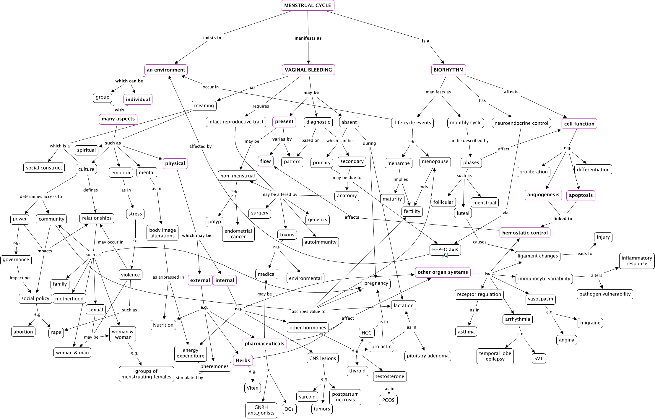 This Concept Map, created with IHMC CmapTools, has information related to: menstrual_cycle_hemostasis_highlights_10_22, Herbs e.g. Vitex, life cycle events e.g. menopause, pharmaceuticals affect other organ systems, power impacts relationships, testosterone as in PCOS, BIORHYTHM manifests as monthly cycle, external e.g. pheremones, cell function e.g. differentiation, emotion as in stress, body image alterations as expressed in energy expenditure, apoptosis linked to hemostatic control, diagnostic based on pattern, menarche implies maturity, HCG as in pregnancy, meaning such as emotion, many aspects such as emotion, prolactin as in pituitary adenoma, meaning which is a social construct, physical which may be internal, culture determines access to power