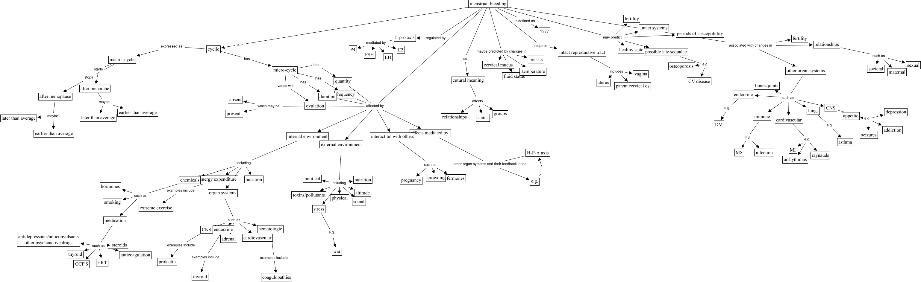 This Concept Map, created with IHMC CmapTools, has information related to: menstrual_cycle_jat_9_4_clean, duration affected by interaction with others, after menopause maybe earlier than average, possible late sequalae e.g. osteoporosis, menstrual bleeding maybe predicted by changes in temperature, internal environment including organ systems, cutural meaning affects status, frequency affected by affects mediated by, external environment including physical, intact reproductive tract includes patent cervical os, macro -cycle stops after menopause, after menarche maybe later than average, external environment including social, cardivascular e.g. arrhythmias, external environment including stress, organ systems such as cardiovascular, lungs e.g. asthma, relationships such as maternal, energy expenditure examples include extreme exercise, menstrual bleeding affected by external environment, after menopause maybe later than average