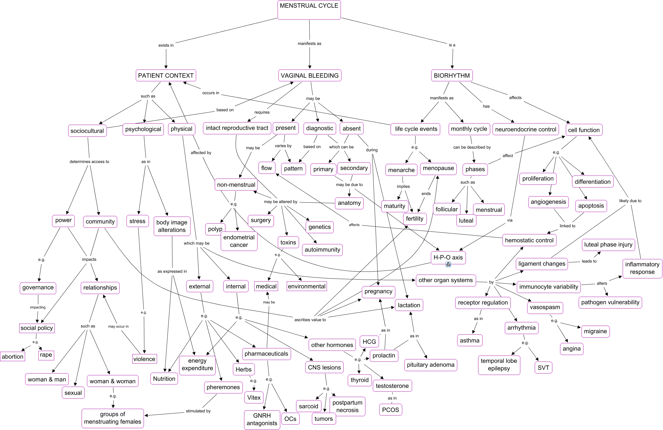 This Concept Map, created with IHMC CmapTools, has information related to: menstrual_cycle_all_10_20, external e.g. pharmaceuticals, woman & woman e.g. groups of menstruating females, CNS lesions e.g. postpartum necrosis, cell function e.g. apoptosis, sociocultural determines access to community, external e.g. Herbs, PATIENT CONTEXT such as psychological, arrhythmia e.g. temporal lobe epilepsy, violence may occur in relationships, angiogenesis linked to hemostatic control, body image alterations as expressed in Nutrition, present may be non-menstrual, life cycle events e.g. menarche, intact reproductive tract may be altered by non-menstrual, life cycle events occurs in PATIENT CONTEXT, present varies by flow, receptor regulation as in asthma, CNS lesions e.g. tumors, external e.g. Nutrition, MENSTRUAL CYCLE is a BIORHYTHM