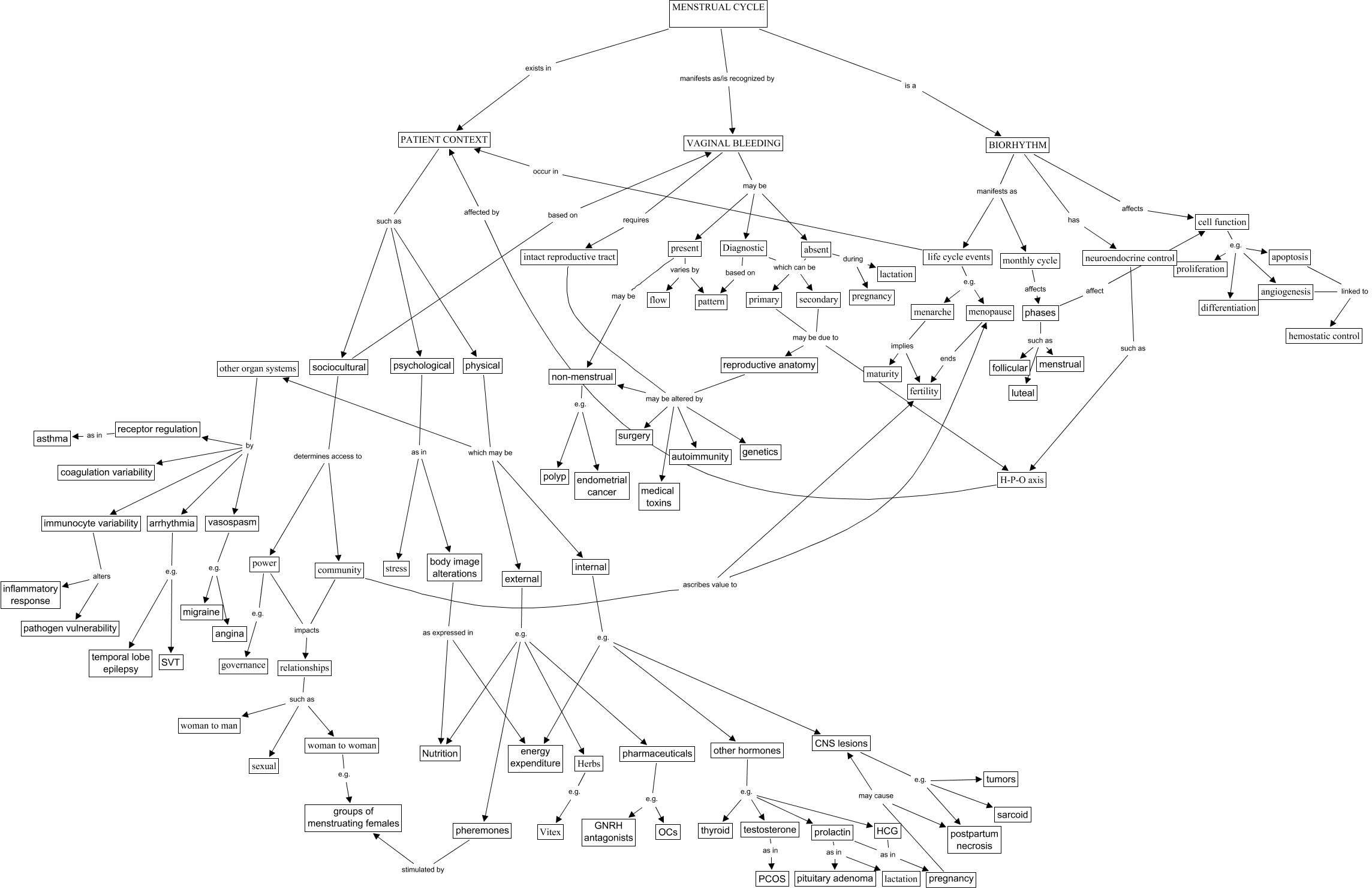 This Concept Map, created with IHMC CmapTools, has information related to: menstrual_cycle_kpn_10_11_emh_10_12, menopause ends fertility, reproductive anatomy may be altered by genetics, PATIENT CONTEXT such as sociocultural, sociocultural based on VAGINAL BLEEDING, absent during pregnancy, other organ systems by receptor regulation, relationships such as woman to woman, immunocyte variability alters pathogen vulnerability, VAGINAL BLEEDING requires intact reproductive tract, physical which may be other organ systems, Diagnostic which can be secondary, Diagnostic which can be primary, external e.g. pharmaceuticals, phases such as menstrual, vasospasm e.g. migraine, primary may be due to reproductive anatomy, immunocyte variability alters inflammatory response, phases such as luteal, external e.g. Nutrition, present varies by flow