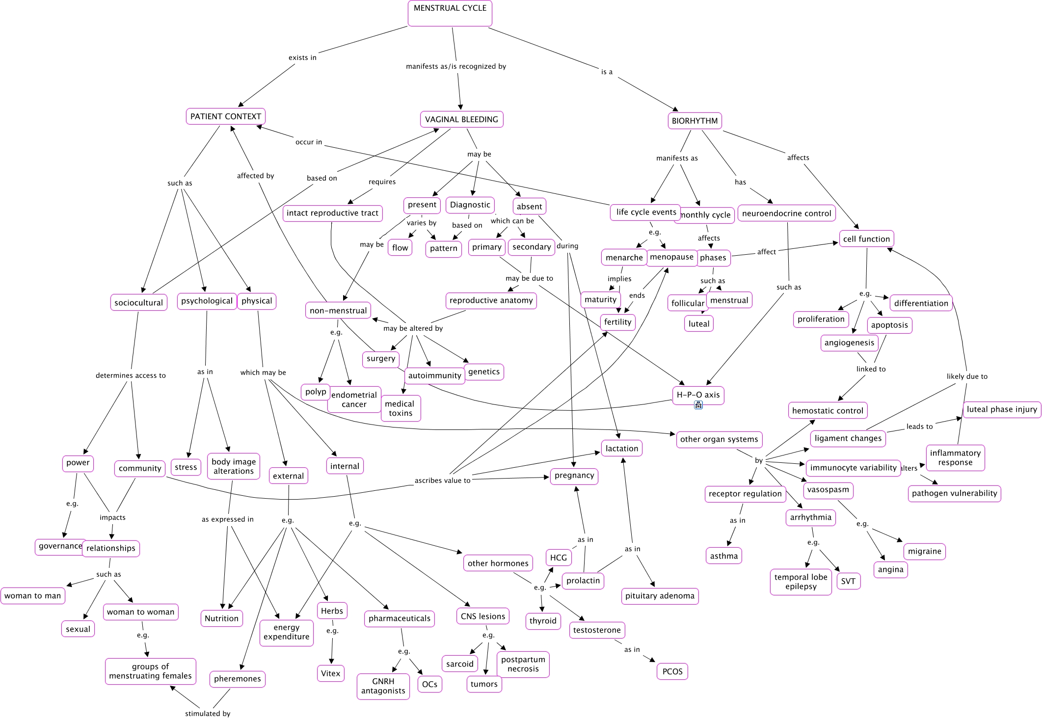 This Concept Map, created with IHMC CmapTools, has information related to: menstrual_cycle_all_10_15, reproductive anatomy may be altered by autoimmunity, Diagnostic which can be primary, community impacts relationships, BIORHYTHM has neuroendocrine control, primary may be due to H-P-O axis, internal e.g. CNS lesions, secondary may be due to reproductive anatomy, phases such as follicular, PATIENT CONTEXT such as sociocultural, internal e.g. other hormones, cell function e.g. differentiation, internal e.g. energy expenditure, arrhythmia e.g. SVT, other hormones e.g. thyroid, phases such as luteal, intact reproductive tract may be altered by autoimmunity, external e.g. Nutrition, life cycle events occur in PATIENT CONTEXT, vasospasm e.g. migraine, present varies by pattern