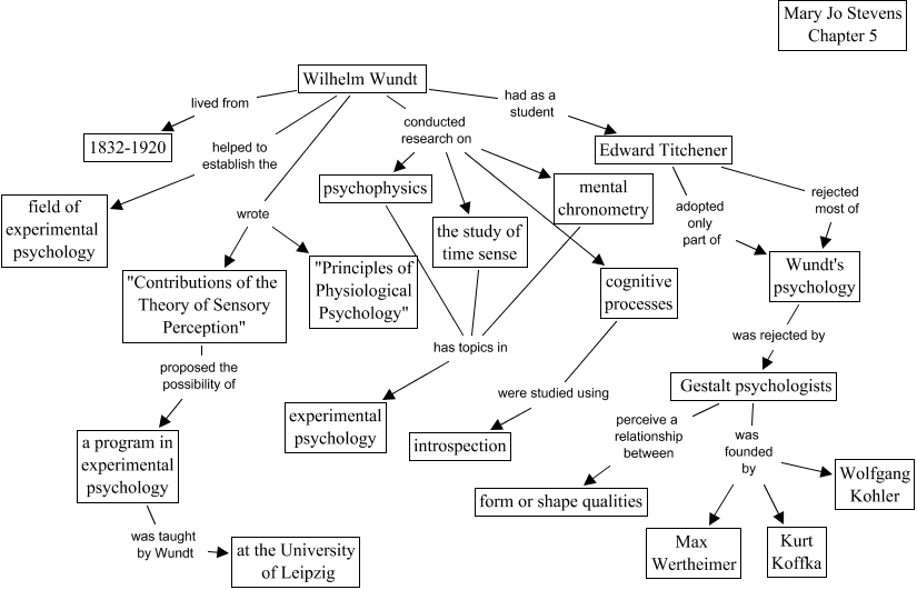 This Concept Map, created with IHMC CmapTools, has information related to: chapter 5d, the study of time sense has topics in experimental psychology, Wilhelm Wundt conducted research on mental chronometry, Wilhelm Wundt wrote "Contributions of the Theory of Sensory Perception", Wilhelm Wundt conducted research on cognitive processes, Wilhelm Wundt lived from 1832-1920, Gestalt psychologists was founded by Wolfgang Kohler, cognitive processes were studied using introspection, "Contributions of the Theory of Sensory Perception" proposed the possibility of a program in experimental psychology, psychophysics has topics in experimental psychology, a program in experimental psychology was taught by Wundt at the University of Leipzig, Wilhelm Wundt wrote "Principles of Physiological Psychology", Gestalt psychologists perceive a relationship between form or shape qualities, Edward Titchener adopted only part of Wundt's psychology, Wundt's psychology was rejected by Gestalt psychologists, Wilhelm Wundt helped to establish the field of experimental psychology, Edward Titchener rejected most of Wundt's psychology, Gestalt psychologists was founded by Max Wertheimer, mental chronometry has topics in experimental psychology, Wilhelm Wundt had as a student Edward Titchener, Gestalt psychologists was founded by Kurt Koffka