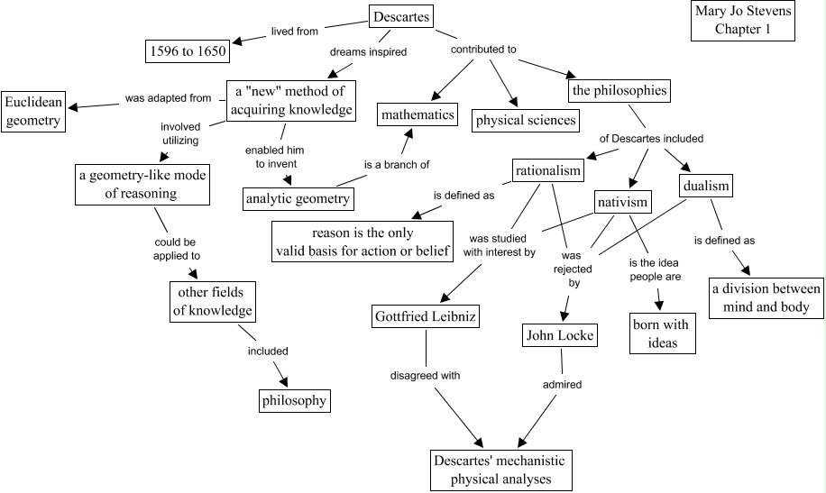 This Concept Map, created with IHMC CmapTools, has information related to: Rene Descartes 9, rationalism is defined as reason is the only valid basis for action or belief, nativism was rejected by John Locke, a "new" method of acquiring knowledge was adapted from Euclidean geometry, Descartes lived from 1596 to 1650, a "new" method of acquiring knowledge enabled him to invent analytic geometry, analytic geometry is a branch of mathematics, rationalism was studied with interest by Gottfried Leibniz, Descartes contributed to mathematics, Descartes contributed to physical sciences, dualism is defined as a division between mind and body, nativism is the idea people are born with ideas, Descartes contributed to the philosophies, dualism was rejected by John Locke, the philosophies of Descartes included dualism, the philosophies of Descartes included rationalism, Gottfried Leibniz disagreed with Descartes' mechanistic physical analyses, a geometry-like mode of reasoning could be applied to other fields of knowledge, the philosophies of Descartes included nativism, nativism was studied with interest by Gottfried Leibniz, rationalism was rejected by John Locke