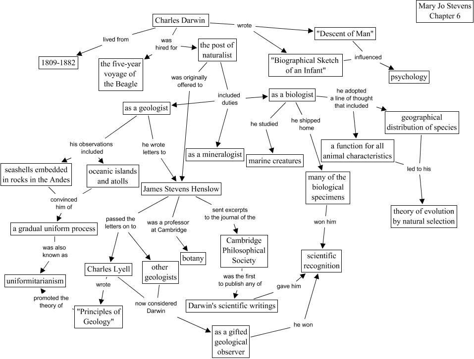 This Concept Map, created with IHMC CmapTools, has information related to: chapter 6g, as a gifted geological observer he won scientific recognition, as a geologist his observations included seashells embedded in rocks in the Andes, Charles Lyell now considered Darwin as a gifted geological observer, Charles Darwin was hired for the post of naturalist, James Stevens Henslow was a professor at Cambridge botany, geographical distribution of species led to his theory of evolution by natural selection, the post of naturalist was originally offered to James Stevens Henslow, Charles Darwin lived from 1809-1882, "Principles of Geology" promoted the theory of uniformitarianism, a gradual uniform process was also known as uniformitarianism, as a biologist he adopted a line of thought that included a function for all animal characteristics, seashells embedded in rocks in the Andes convinced him of a gradual uniform process, a function for all animal characteristics led to his theory of evolution by natural selection, James Stevens Henslow sent excerpts to the journal of the Cambridge Philosophical Society, Charles Darwin wrote "Biographical Sketch of an Infant", the post of naturalist included duties as a biologist, as a biologist he shipped home many of the biological specimens, the post of naturalist included duties as a geologist, oceanic islands and atolls convinced him of a gradual uniform process, James Stevens Henslow passed the letters on to other geologists