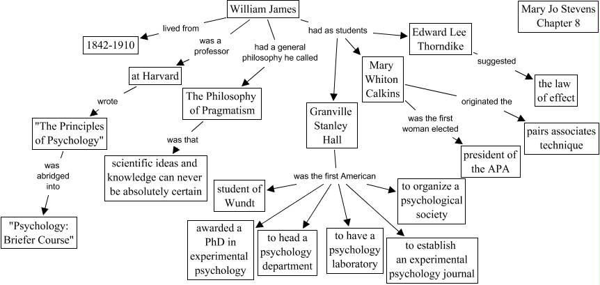 This Concept Map, created with IHMC CmapTools, has information related to: chapter 8f, "The Principles of Psychology" was abridged into "Psychology: Briefer Course", William James had a general philosophy he called The Philosophy of Pragmatism, Granville Stanley Hall was the first American awarded a PhD in experimental psychology, William James was a professor at Harvard, at Harvard wrote "The Principles of Psychology", Mary Whiton Calkins was the first woman elected president of the APA, William James had as students Mary Whiton Calkins, Granville Stanley Hall was the first American to have a psychology laboratory, Granville Stanley Hall was the first American to organize a psychological society, Granville Stanley Hall was the first American to head a psychology department, Granville Stanley Hall was the first American student of Wundt, Edward Lee Thorndike suggested the law of effect, William James had as students Edward Lee Thorndike, William James lived from 1842-1910, The Philosophy of Pragmatism was that scientific ideas and knowledge can never be absolutely certain, Granville Stanley Hall was the first American to establish an experimental psychology journal, Mary Whiton Calkins originated the pairs associates technique, William James had as students Granville Stanley Hall