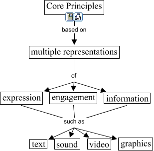 Este Cmap, tiene información relacionada con: UDE Core Principles, expression such as video, engagement such as text, information such as text, expression such as sound, engagement such as video, multiple representations of engagement, multiple representations of information, information such as video, Core Principles based on multiple representations, information such as graphics, expression such as graphics, multiple representations of expression, information such as sound, engagement such as sound, expression such as text, engagement such as graphics