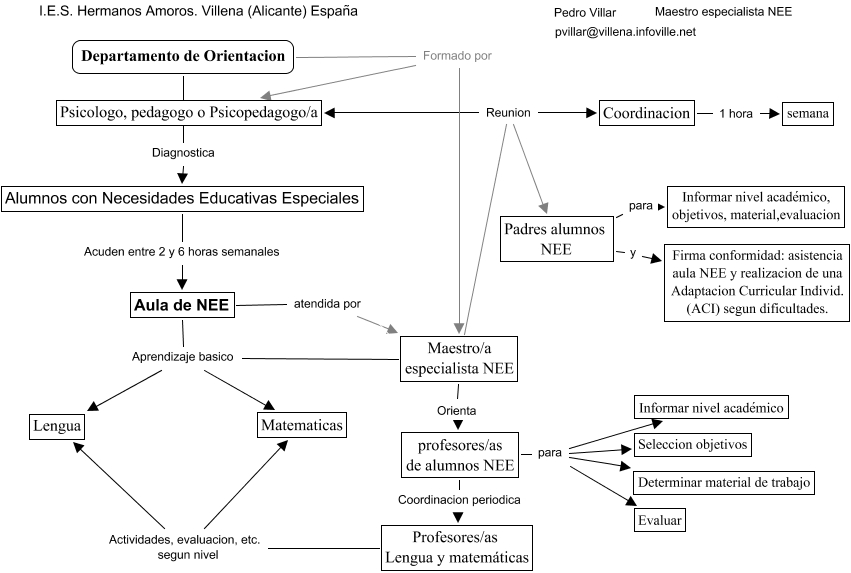 Este Cmap, tiene información relacionada con: Necesidades Educativas Especiales Org., Psicologo, pedagogo o Psicopedagogo/a Orienta profesores/as de alumnos NEE, Aula de NEE Aprendizaje basico Lengua, Aula de NEE atendida por Maestro/a especialista NEE, Profesores/as Lengua y matemáticas Actividades, evaluacion, etc. segun nivel Matematicas, Departamento de Orientacion Diagnostica Alumnos con Necesidades Educativas Especiales, Maestro/a especialista NEE Reunion Coordinacion, Maestro/a especialista NEE Reunion Psicologo, pedagogo o Psicopedagogo/a, profesores/as de alumnos NEE para Determinar material de trabajo, Maestro/a especialista NEE Aprendizaje basico Matematicas, profesores/as de alumnos NEE para Evaluar, Departamento de Orientacion Formado por Maestro/a especialista NEE, Maestro/a especialista NEE Orienta profesores/as de alumnos NEE, Coordinacion 1 hora semana, Alumnos con Necesidades Educativas Especiales Acuden entre 2 y 6 horas semanales Aula de NEE, Padres alumnos NEE y Firma conformidad: asistencia aula NEE y realizacion de una Adaptacion Curricular Individ. (ACI) segun dificultades., profesores/as de alumnos NEE para Seleccion objetivos, Aula de NEE Aprendizaje basico Matematicas, profesores/as de alumnos NEE Coordinacion periodica Profesores/as Lengua y matemáticas, profesores/as de alumnos NEE para Informar nivel académico, Padres alumnos NEE para Informar nivel académico, objetivos, material,evaluacion