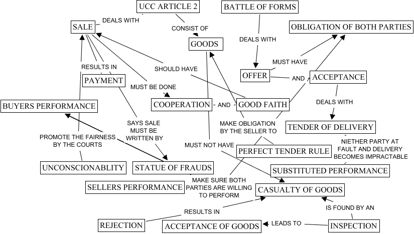 This Concept Map, created with IHMC CmapTools, has information related to: NINERTWO, BUYERS PERFORMANCE MAKE SURE BOTH PARTIES ARE WILLING TO PERFORM OBLIGATION OF BOTH PARTIES, UCC ARTICLE 2 CONSIST OF GOODS, BATTLE OF FORMS DEALS WITH OFFER, SELLERS PERFORMANCE MAKE SURE BOTH PARTIES ARE WILLING TO PERFORM OBLIGATION OF BOTH PARTIES, OFFER MUST HAVE OBLIGATION OF BOTH PARTIES, SALE DEALS WITH UCC ARTICLE 2, REJECTION RESULTS IN CASUALTY OF GOODS, TENDER OF DELIVERY NIETHER PARTY AT FAULT AND DELIVERY BECOMES IMPRACTABLE SUBSTITUTED PERFORMANCE, PERFECT TENDER RULE MAKE OBLIGATION BY THE SELLER TO GOODS, GOOD FAITH SHOULD HAVE SALE, ACCEPTANCE DEALS WITH TENDER OF DELIVERY, SALE SAYS SALE MUST BE WRITTEN BY STATUE OF FRAUDS, BUYERS PERFORMANCE MAKE SURE BOTH PARTIES ARE WILLING TO PERFORM OBLIGATION OF BOTH PARTIES, UNCONSCIONABLITY PROMOTE THE FAIRNESS BY THE COURTS SALE, SALE RESULTS IN PAYMENT, GOODS MUST NOT HAVE CASUALTY OF GOODS, COOPERATION AND GOOD FAITH, SALE MUST BE DONE COOPERATION, OFFER AND ACCEPTANCE, SELLERS PERFORMANCE MAKE SURE BOTH PARTIES ARE WILLING TO PERFORM BUYERS PERFORMANCE