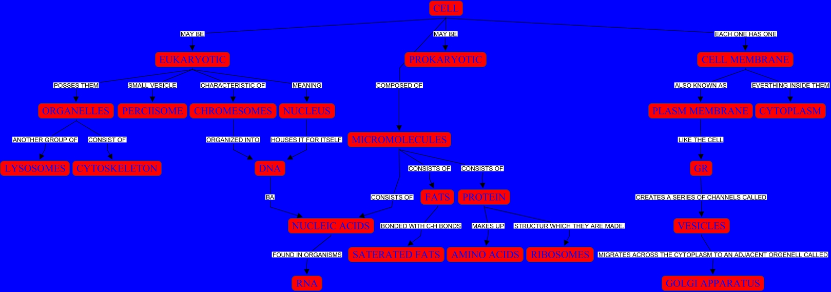 This Concept Map, created with IHMC CmapTools, has information related to: NOAHERIC, CELL COMPOSED OF MICROMOLECULES, CHROMESOMES ORGANIZED INTO DNA, FATS BONDED WITH C-H BONDS SATERATED FATS, CELL MEMBRANE ALSO KNOWN AS PLASM MEMBRANE, EUKARYOTIC SMALL VESICLE PERCIISOME, CELL MEMBRANE EVERTHING INSIDE THEM CYTOPLASM, CELL EACH ONE HAS ONE CELL MEMBRANE, EUKARYOTIC POSSES THEM ORGANELLES, PLASM MEMBRANE LIKE THE CELL GR, MICROMOLECULES CONSISTS OF NUCLEIC ACIDS, MICROMOLECULES CONSISTS OF FATS, CELL MAY BE EUKARYOTIC, GR CREATES A SERIES OF CHANNELS CALLED VESICLES, MICROMOLECULES CONSISTS OF PROTEIN, ORGANELLES CONSIST OF CYTOSKELETON, EUKARYOTIC MEANING NUCLEUS, ORGANELLES ANOTHER GROUP OF LYSOSOMES, NUCLEIC ACIDS FOUND IN ORGANISMS RNA, DNA BA NUCLEIC ACIDS, CELL MAY BE PROKARYOTIC