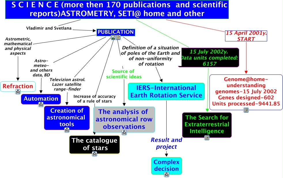 This Concept Map, created with IHMC CmapTools, has information related to: SCIENCE, PUBLICATION Source of scientific ideas The analysis of astronomical row observations, S C I E N C E (more then 170 publications and scientific reports)ASTROMETRY, SETI@ home and other 15 July 2002y. Data units completed: 6157 The Search for Extraterrestrial Intelligence, PUBLICATION Televizion astrol. Lazer satellite range-finder Creation of astronomical tools, S C I E N C E (more then 170 publications and scientific reports)ASTROMETRY, SETI@ home and other Vladimir and Svetlana PUBLICATION, PUBLICATION Definition of a situation of poles of the Earth and of non-uniformity of rotation IERS-International Earth Rotation Service, PUBLICATION Astrometric, mathematical and physical aspects Refraction, PUBLICATION Astro- meteo- and others data, BD Automation, S C I E N C E (more then 170 publications and scientific reports)ASTROMETRY, SETI@ home and other 15 April 2001y. START Genome@home- understanding genomes-15 July 2002 Genes designed-602 Units processed-9441.85, IERS-International Earth Rotation Service Result and project Complex decision, PUBLICATION Increase of accuracy of a rule of stars The catalogue of stars