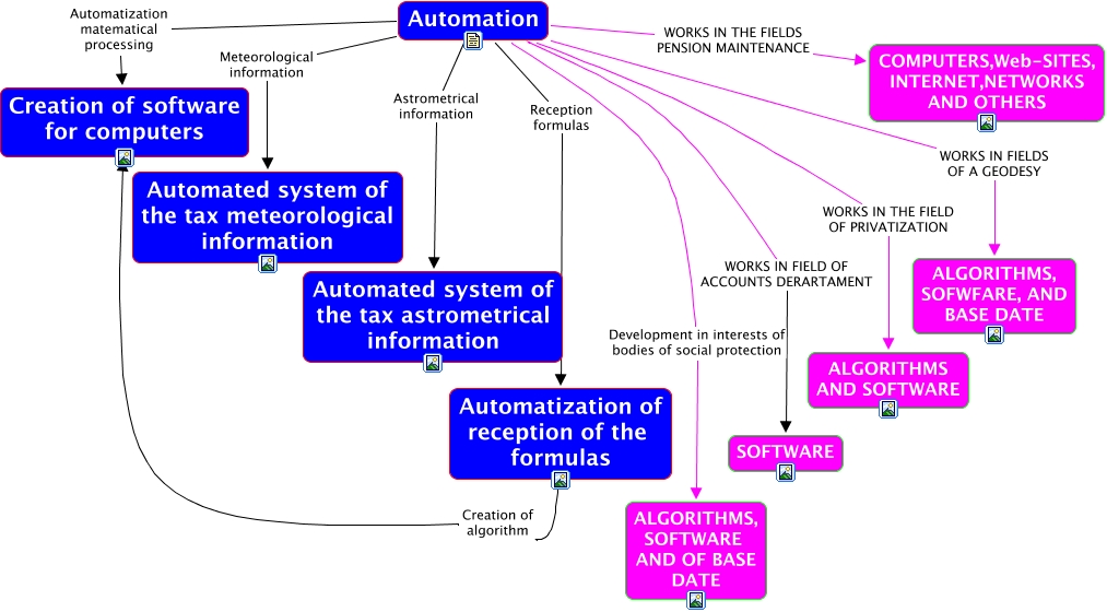This Concept Map, created with IHMC CmapTools, has information related to: Automation, Automation WORKS IN FIELD OF ACCOUNTS DERARTAMENT SOFTWARE, Automatization of reception of the formulas Creation of algorithm Creation of software for computers, Automation WORKS IN FIELDS OF A GEODESY ALGORITHMS, SOFWFARE, AND BASE DATE, Automation Reception formulas Automatization of reception of the formulas, Automation Development in interests of bodies of social protection ALGORITHMS, SOFTWARE AND OF BASE DATE, Automation WORKS IN THE FIELD OF PRIVATIZATION ALGORITHMS AND SOFTWARE, Automation Automatization matematical processing Creation of software for computers, Automation Astrometrical information Automated system of the tax astrometrical information, Automation WORKS IN THE FIELDS PENSION MAINTENANCE COMPUTERS,Web-SITES, INTERNET,NETWORKS AND OTHERS, Automation Meteorological information Automated system of the tax meteorological information