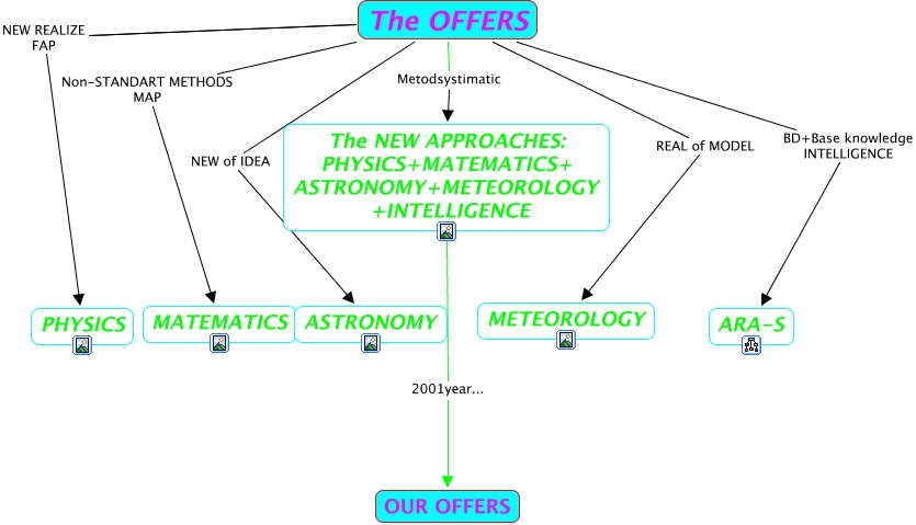 This Concept Map, created with IHMC CmapTools, has information related to: Ref-offers, The NEW APPROACHES: PHYSICS+MATEMATICS+ ASTRONOMY+METEOROLOGY +INTELLIGENCE 2001year... OUR OFFERS, The OFFERS NEW of IDEA ASTRONOMY, The OFFERS REAL of MODEL METEOROLOGY, The OFFERS Metodsystimatic The NEW APPROACHES: PHYSICS+MATEMATICS+ ASTRONOMY+METEOROLOGY +INTELLIGENCE, The OFFERS BD+Base knowledge INTELLIGENCE ARA-S, The OFFERS NEW REALIZE FAP PHYSICS, The OFFERS Non-STANDART METHODS MAP MATEMATICS, The OFFERS NEW REALIZE FAP PHYSICS