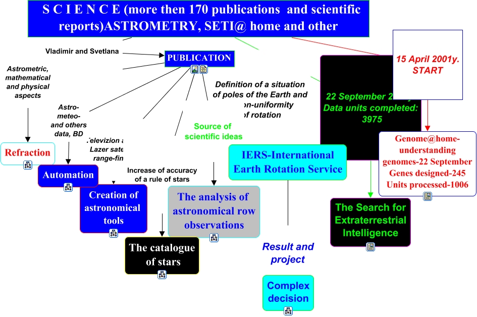 Este Cmap, tiene información relacionada con: SCIENCE, PUBLICATION Astro- meteo- and others data, BD Automation, PUBLICATION Increase of accuracy of a rule of stars The catalogue of stars, S C I E N C E (more then 170 publications and scientific reports)ASTROMETRY, SETI@ home and other 15 April 2001y. START Genome@home- understanding genomes-22 September Genes designed-245 Units processed-1006, PUBLICATION Definition of a situation of poles of the Earth and of non-uniformity of rotation IERS-International Earth Rotation Service, S C I E N C E (more then 170 publications and scientific reports)ASTROMETRY, SETI@ home and other 22 September 2001y. Data units completed: 3975 The Search for Extraterrestrial Intelligence, PUBLICATION Televizion astrol. Lazer satellite range-finder Creation of astronomical tools, PUBLICATION Astrometric, mathematical and physical aspects Refraction, IERS-International Earth Rotation Service Result and project Complex decision, S C I E N C E (more then 170 publications and scientific reports)ASTROMETRY, SETI@ home and other Vladimir and Svetlana PUBLICATION, PUBLICATION Source of scientific ideas The analysis of astronomical row observations