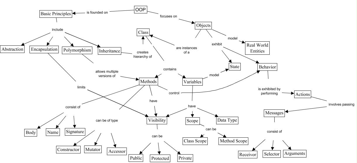 This Concept Map, created with IHMC CmapTools, has information related to: OOP Top Layer, Objects are instances of a Class, Basic Principles include Inheritance, Variables have Data Type, Basic Principles include Abstraction, Messages consist of Selector, Methods can be of type Accessor, OOP is founded on Basic Principles, Methods control Behavior, OOP focuses on Objects, Scope can be Method Scope, Messages consist of Arguments, Visibility can be Public, Basic Principles include Encapsulation, Methods consist of Body, Visibility can be Protected, Methods can be of type Constructor, Objects model Real World Entities, Objects exhibit Behavior, Class contains Methods, Basic Principles include Polymorphism