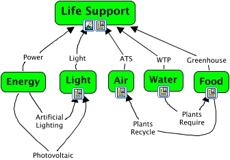 This Concept Map, created with IHMC CmapTools, has information related to: Life Support, Energy Photovoltaic Light, Water WTP Life Support, Energy Power Life Support, Energy Artificial Lighting Light, Air ATS Life Support, Water Plants Require Food, Food Plants Recycle Air, Light Light Life Support, Food Greenhouse Life Support