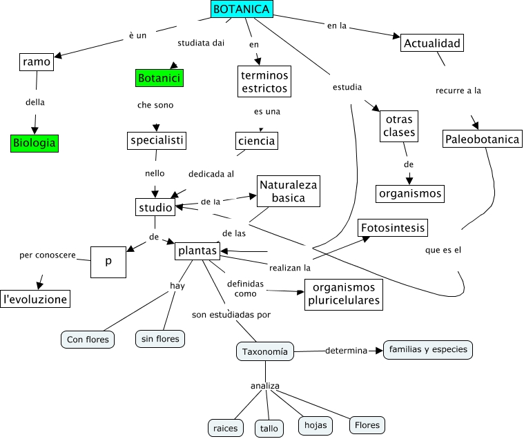 Questa Cmap, creata con IHMC CmapTools, contiene informazioni relative a: Botanica, Naturaleza basica de las plantas, Taxonomía determina familias y especies, BOTANICA estudia plantas, plantas definidas como organismos pluricelulares, Taxonomía analiza raices, ramo della Biologia, BOTANICA estudia otras clases, studio de p, BOTANICA en terminos estrictos, plantas hay Con flores, studio de la Naturaleza basica, Taxonomía analiza hojas, BOTANICA en la Actualidad, ciencia dedicada al studio, Botanici che sono specialisti, Taxonomía analiza Flores, BOTANICA è un ramo, terminos estrictos es una ciencia, BOTANICA studiata dai Botanici, specialisti nello studio