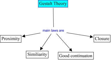 This Concept Map, created with IHMC CmapTools, has information related to: Gestalt, Gestalt Theory main laws are Similiarity, Gestalt Theory main laws are Proximity, Gestalt Theory main laws are Good continuaton, Gestalt Theory main laws are Closure