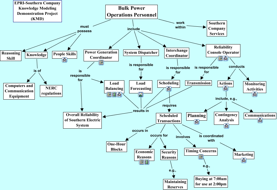 This Concept Map, created with IHMC CmapTools, has information related to: Bulk Power Operations, Timing Concerns e.g., Buying at 7:00am for use at 2:00pm, Knowledge is of NERC regulations, Scheduling results in Overall Reliability of Southern Electric System, Transmission results in Overall Reliability of Southern Electric System, Scheduled Transactions occurs in One-Hour Blocks, Load Balancing results in Overall Reliability of Southern Electric System, Bulk Power Operations Personnel include Reliability Console Operator, Bulk Power Operations Personnel must possess Reasoning Skill, Actions include, e.g., Planning, Reliability Console Operator conducts Monitoring Activities, Reliability Console Operator is responsible for Transmission, Power Generation Coordinator is responsible for Load Balancing, Bulk Power Operations Personnel work within Southern Company Services, Scheduled Transactions occurs for Economic Reasons, Actions include, e.g., Contingency Analysis, Scheduling requires Scheduled Transactions, Bulk Power Operations Personnel include System Dispatcher, Scheduled Transactions is coordinated with Marketing, System Dispatcher is responsible for Load Forecasting, Scheduled Transactions occurs for Security Reasons