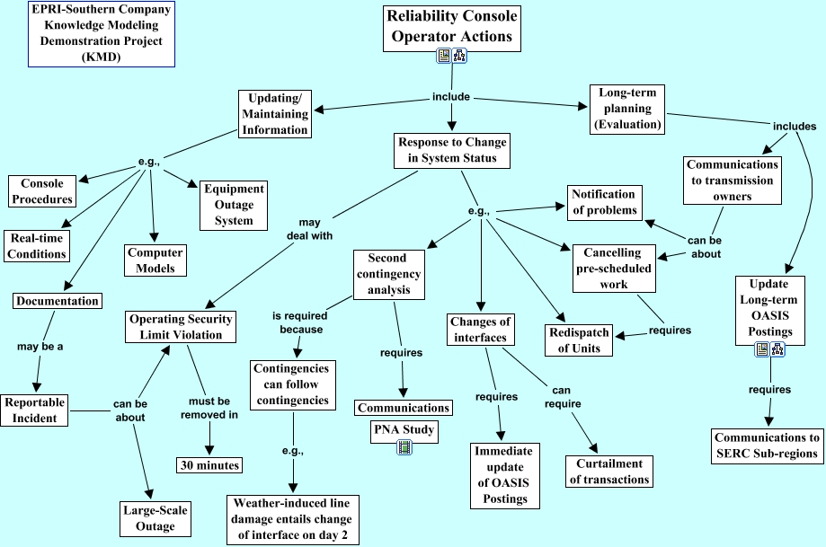 This Concept Map, created with IHMC CmapTools, has information related to: RCO_ActionsV2, Reliability Console Operator Actions include Updating/ Maintaining Information, Updating/ Maintaining Information e.g., Documentation, Documentation may be a Reportable Incident, Reliability Console Operator Actions include Long-term planning (Evaluation), Updating/ Maintaining Information e.g., Console Procedures, Reliability Console Operator Actions include Response to Change in System Status, Second contingency analysis is required because Contingencies can follow contingencies, Long-term planning (Evaluation) includes Communications to transmission owners, Cancelling pre-scheduled work requires Redispatch of Units, Reportable Incident can be about Operating Security Limit Violation, Response to Change in System Status e.g., Changes of interfaces, Contingencies can follow contingencies e.g., Weather-induced line damage entails change of interface on day 2, Response to Change in System Status e.g., Second contingency analysis, Communications to transmission owners can be about Cancelling pre-scheduled work, Update Long-term OASIS Postings requires Communications to SERC Sub-regions, Changes of interfaces can require Curtailment of transactions, Response to Change in System Status e.g., Notification of problems, Communications to transmission owners can be about Notification of problems, Reportable Incident can be about Large-Scale Outage, Response to Change in System Status e.g., Cancelling pre-scheduled work