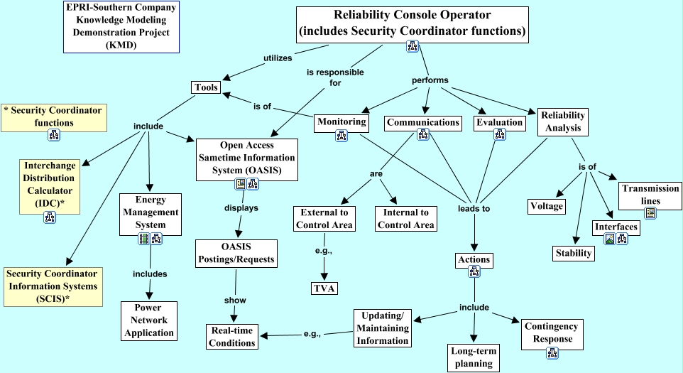 This Concept Map, created with IHMC CmapTools, has information related to: RCO Basic Responsibilities, Reliability Console Operator (includes Security Coordinator functions) performs Communications, Reliability Analysis leads to Actions, Actions include Contingency Response, Reliability Analysis is of Voltage, Actions include Updating/ Maintaining Information, Communications leads to Actions, Reliability Console Operator (includes Security Coordinator functions) performs Evaluation, Energy Management System includes Power Network Application, Reliability Console Operator (includes Security Coordinator functions) utilizes Tools, Reliability Analysis is of Transmission lines, Communications are External to Control Area, Reliability Console Operator (includes Security Coordinator functions) performs Monitoring, OASIS Postings/Requests show Real-time Conditions, Reliability Analysis is of Interfaces, Monitoring is of Tools, Actions include Long-term planning, Reliability Console Operator (includes Security Coordinator functions) performs Reliability Analysis, Communications are Internal to Control Area, Monitoring leads to Actions, Reliability Console Operator (includes Security Coordinator functions) is responsible for Open Access Sametime Information System (OASIS)