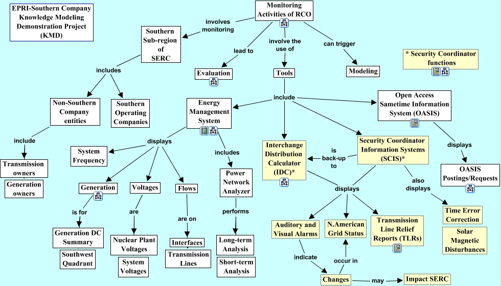 This Concept Map, created with IHMC CmapTools, has information related to: RCO_Monitoring ActivitiesV2, Interchange Distribution Calculator (IDC)* displays Auditory and Visual Alarms, Energy Management System displays Generation, Non-Southern Company entities include Transmission owners, Monitoring Activities of RCO involves monitoring Southern Sub-region of SERC, Generation is for Generation DC Summary, Non-Southern Company entities include Generation owners, Energy Management System displays Voltages, Energy Management System displays Flows, Tools include Open Access Sametime Information System (OASIS), Southern Sub-region of SERC includes Southern Operating Companies, Open Access Sametime Information System (OASIS) displays OASIS Postings/Requests, Auditory and Visual Alarms indicate Changes, Monitoring Activities of RCO can trigger Modeling, Flows are on Transmission Lines, Changes occur in N.American Grid Status, Flows are on Interfaces, Power Network Analyzer performs Long-term Analysis, Energy Management System displays System Frequency, Voltages are System Voltages, Tools include Interchange Distribution Calculator (IDC)*