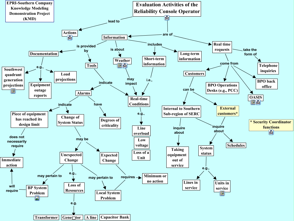 This Concept Map, created with IHMC CmapTools, has information related to: RCO_Evaluation ActivitiesV2, Real-time Conditions e.g., Line overload, Information is about Weather, Customers can be Internal to Southern Sub-region of SERC, Internal to Southern Sub-region of SERC inquire about Schedules, Information includes Long-term information, Evaluation Activities of the Reliability Console Operator are of Information, Unexpected Change may pertain to Local System Problem, Short-term information i.e., Real-time Conditions, Evaluation Activities of the Reliability Console Operator are of Real time requests, Change of System Status may be Unexpected Change, Alarms indicate Piece of equipment has reached its design limit, Real time requests come from OASIS, Alarms have Degrees of criticality, External customers* inquire about Schedules, Real time requests come from BPO back office, Real time requests come from BPO Operations Desks (e.g., PCC), Documentation e.g., Southwest quadrant generation projections, Internal to Southern Sub-region of SERC inquire about System status, Documentation e.g., Equipment outage reports, Change of System Status may be Expected Change